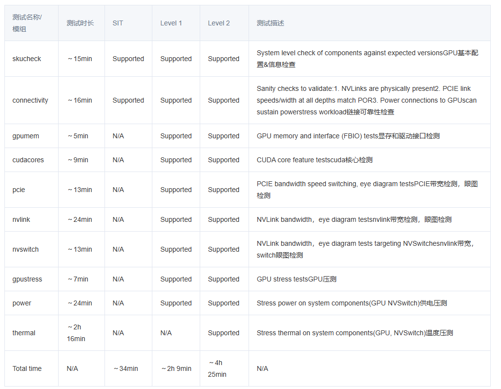 DCGM Diagnostics提供了系统级的英伟达GPU卡检测工具,采用level1,level2,level3和level4的诊断级别,检测软件,pcie+nvlink,GPU memory,Memory Bandwidth, Diagnostics,Targeted Stress,Targeted Power,Memory Stress,Input EDPp方面的检测