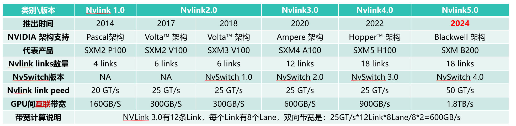 Nvlink是英伟达私有的芯片互联技术,通常用于GPU之间或者GPU到CPU,Nv Switch是基于Nvlink技术的芯片或者类似交换机的设备,在主机内部NvSwitch是芯片,跨节点互联就是搭载Nv switch芯片的独立网络设备。历代Nvlink的版本和速率变化如下: