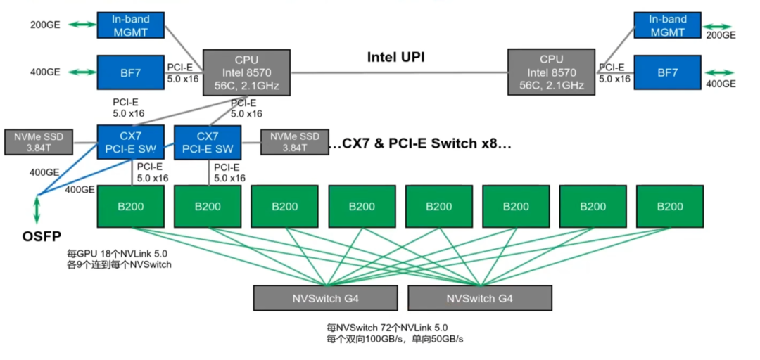 2024年,Blackwell架构的B200正式发布,NVLink和NVSwitch芯片分别来到5.0和4.0的版本,单条链路速率翻倍来到单向50GB/s,数量还是18条,GPU间的互联带宽翻倍至1.8TB/s,8个GPU对应2个NVswitch芯片,每个NvSwitch芯片拥有72个NVLink5.0接口,每个GPU用9条NVLink和2个NVSwitch芯片互联,如下图所示